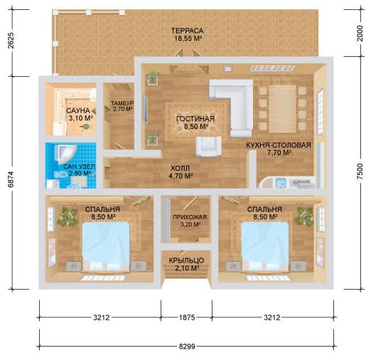 Данная комплектация представлена в виде базовой. Так же, она может быть изменена по вашему желанию, как по планировке, так и по виду строительного материала.